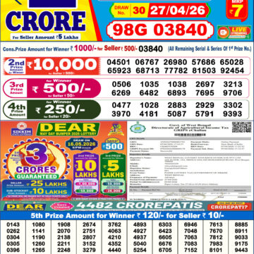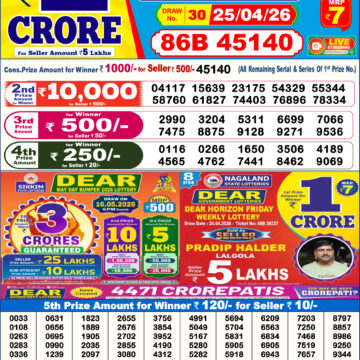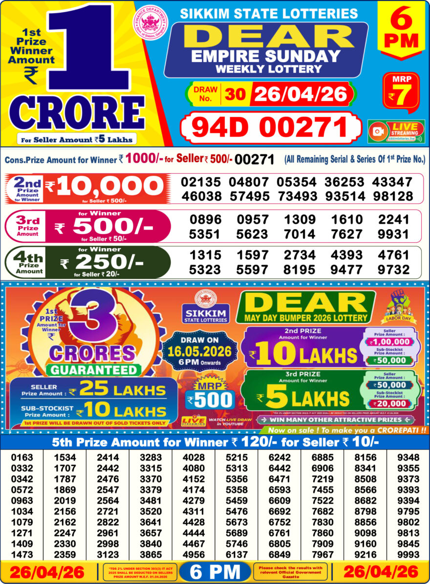 Today's result for Dear Empire Sunday Weekly Lottery Result 6:00 PM 26 04 2026 is scheduled to be announced at 6:00 PM.