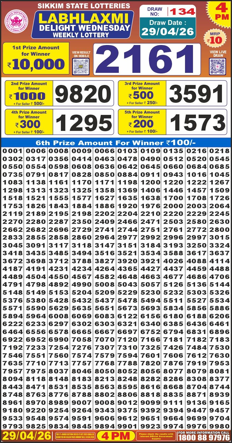 Today's result for Labh Laxmi Delight Wednesday Weekly Lottery Result 29 04 2026 is scheduled to be announced at 4:00 PM.