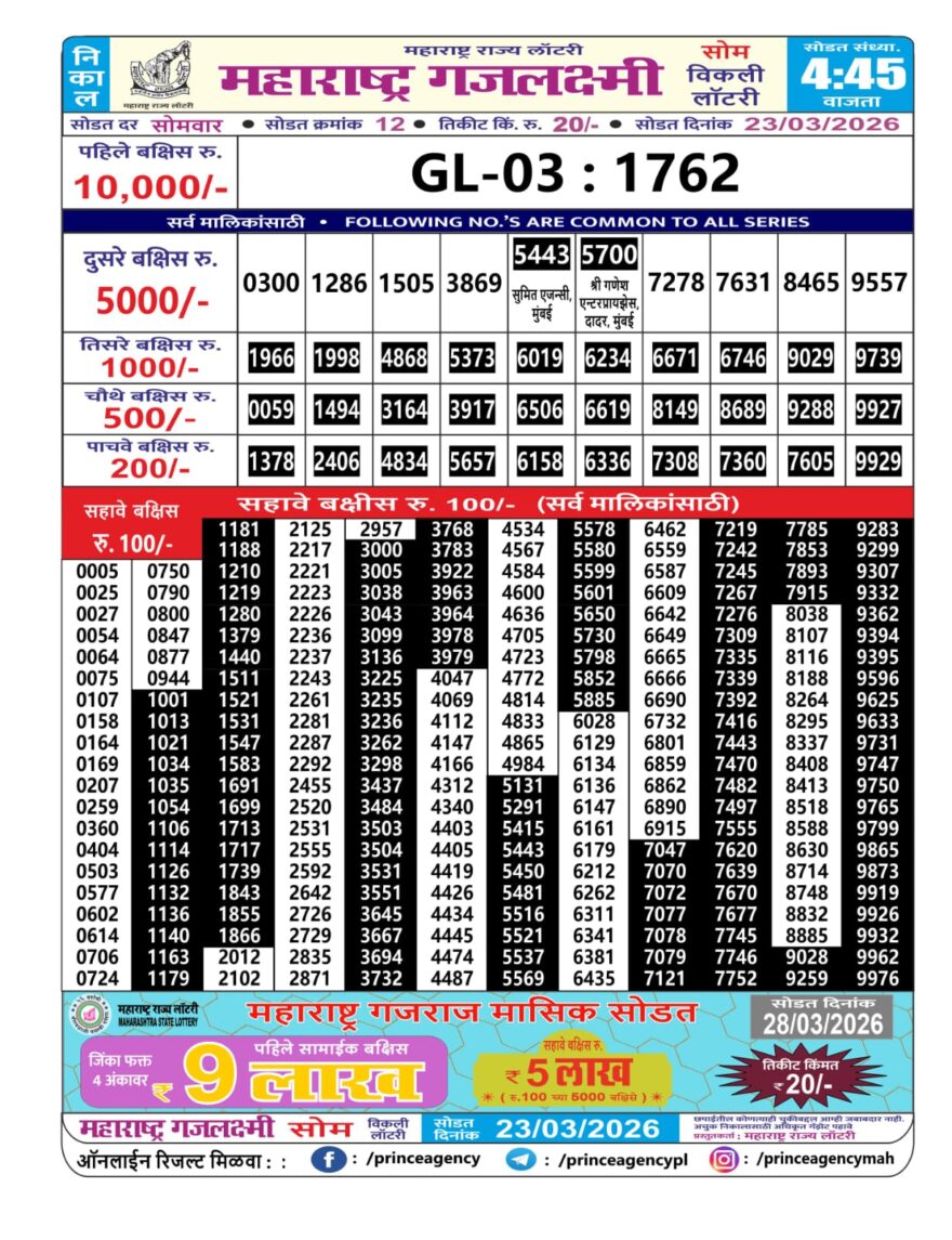 Maharashtra Gajlaxmi Lottery Result 23 03 26 Result Editorial Team March 23, 2026 Posted in Maharashtra Lottery Result Other Results in This Time 0 34 Maharashtra Ganesh Laxmi Lottery Result 20 03 26 0 14 Maharashtra Sahyadri Lottery Result 20 03 26 0 13 Maharashtra Gajlaxmi Lottery Result 20 03 26 0 7 Maharashtra Sahyadri Lottery Result 23 03 26 0 13 Maharashtra Mohini Lottery Result 22 03 26 0 13 Maharashtra Sahyadri Lottery Result 21 03 26 0 8 Maharashtra Ganesh Laxmi Lottery Result 23 03 26 Author: Result Editorial Team Website
