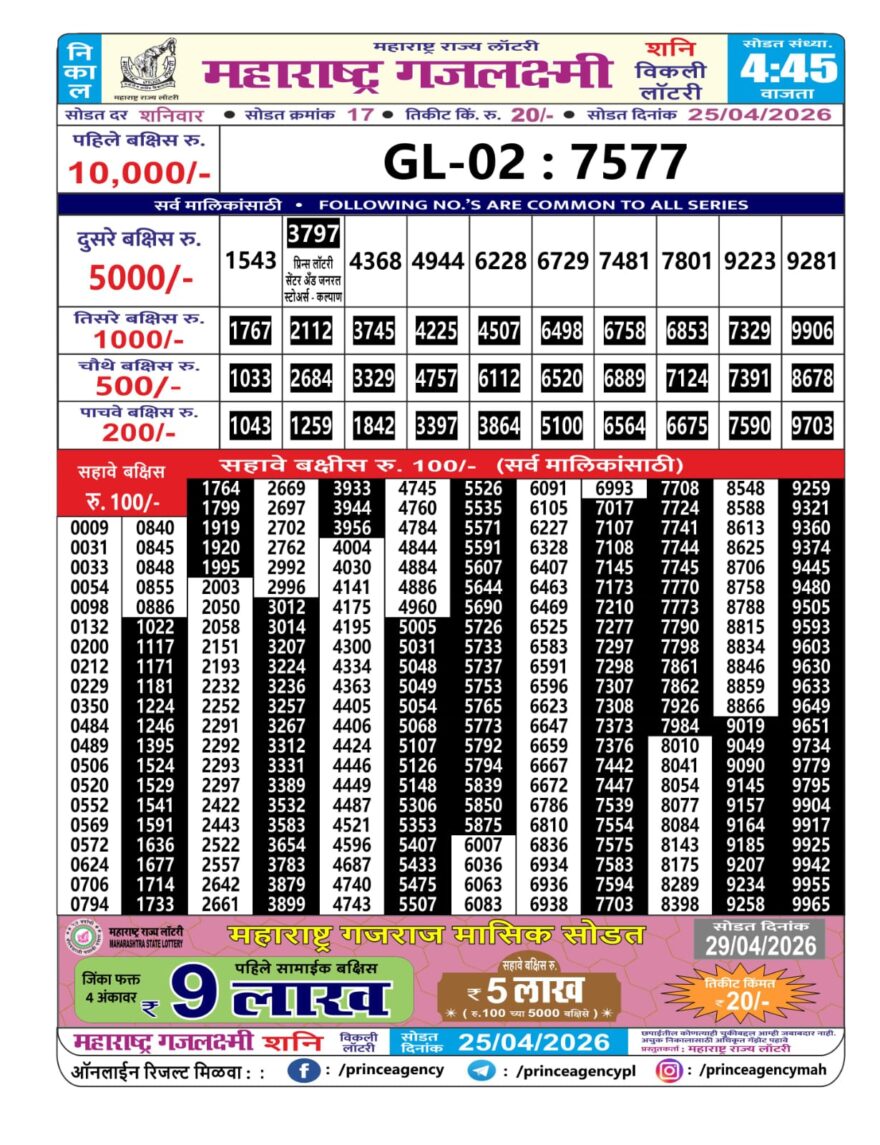 Maharashtra Gajlaxmi Lottery Result 25 04 26 Result Editorial Team April 25, 2026 Posted in Maharashtra Lottery Result Other Results in This Time 0 34 Maharashtra Gajlaxmi Lottery Result 26 03 26 0 14 Maharashtra Gajlaxmi Lottery Result 18 04 26 0 32 Maharashtra Lottery Result Today 4PM 25 03 26 0 13 Maharashtra Mohini Lottery Result 19 04 26 0 30 Maharashtra Mohini Lottery Result 29 03 26 0 20 Maharashtra Ganesh Laxmi Lottery Result 08 04 26 0 16 Maharashtra Mohini Lottery Result 12 04 26 Author: Result Editorial Team Website