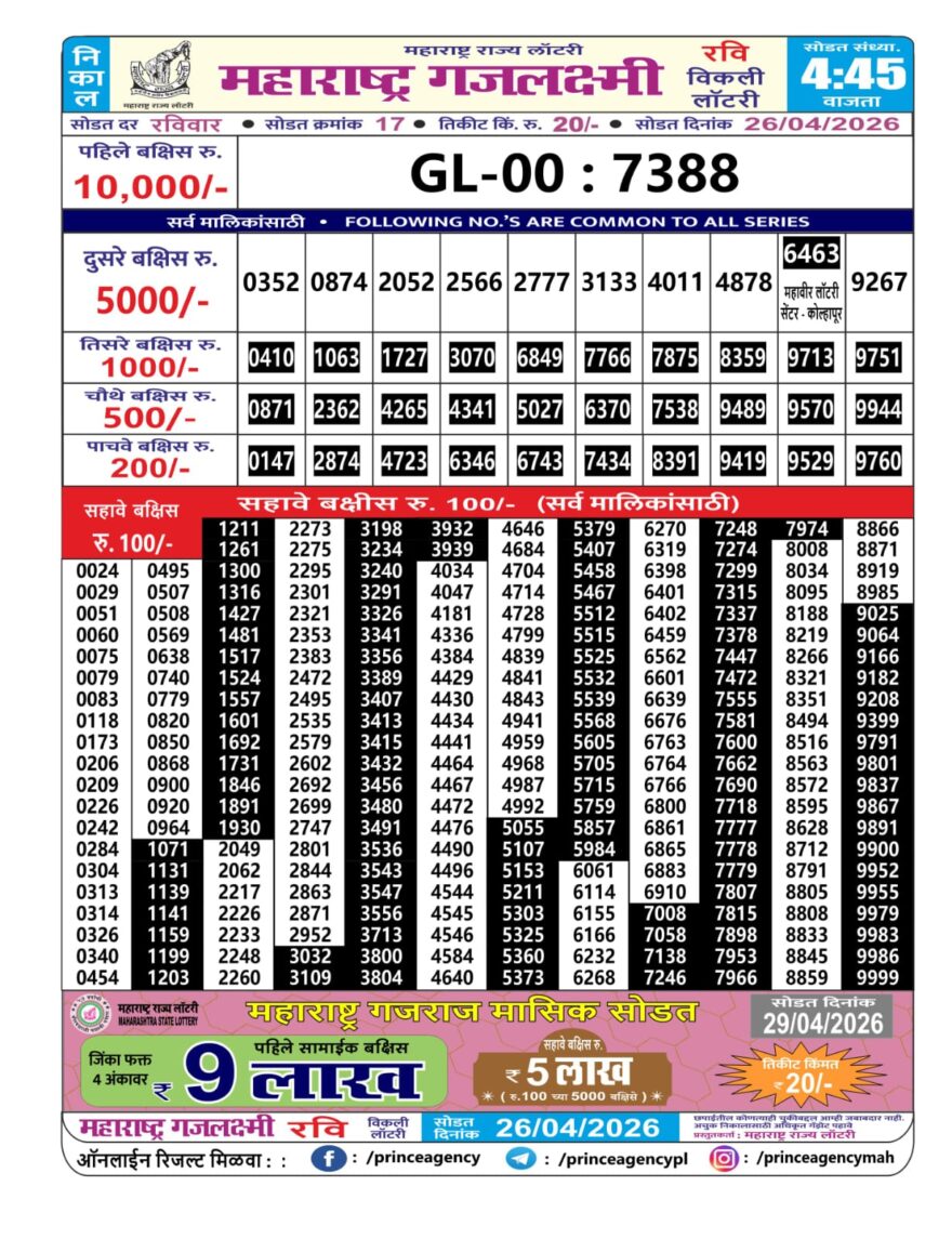 Maharashtra Gajlaxmi Lottery Result 26 04 26 Result Editorial Team April 26, 2026 Posted in Maharashtra Lottery Result Other Results in This Time 0 16 Maharashtra Lottery Result Today 4PM 21 04 26 0 26 Maharashtra Ganesh Laxmi Lottery Result 27 03 26 0 31 Maharashtra Lottery Result Today 4PM 27 03 26 0 38 Maharashtra Ganesh Laxmi Lottery Result 19 03 26 0 18 Maharashtra Ganesh Laxmi Lottery Result 13 04 26 0 24 Maharashtra Lottery Result Today 4PM 09 04 26 0 64 Maharashtra Ganesh Laxmi Lottery Result 20 03 26 Author: Result Editorial Team Website
