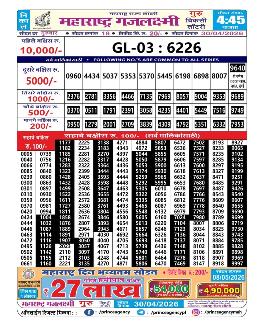 Maharashtra Gajlaxmi Lottery Result 30 04 26 Result Editorial Team April 30, 2026 Posted in Maharashtra Lottery Result Other Results in This Time 0 21 Maharashtra Sahyadri Lottery Result 07 04 26 0 19 Maharashtra Lottery Result Today 4PM 21 04 26 0 31 Maharashtra Ganesh Laxmi Lottery Result 01 04 26 0 23 Maharashtra Lottery Result Today 4PM 07 04 26 0 9 Maharashtra Ganesh Laxmi Lottery Result 27 04 26 0 3 Maharashtra Sahyadri Lottery Result 30 04 26 0 24 Maharashtra Sahyadri Lottery Result 09 04 26 Author: Result Editorial Team Website