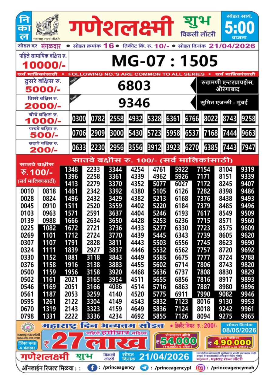 Maharashtra Ganesh Laxmi Lottery Result 21 04 26 Result Editorial Team April 21, 2026 Posted in Maharashtra Lottery Result Other Results in This Time 0 21 Maharashtra Sahyadri Lottery Result 04 04 26 0 25 Maharashtra Sahyadri Lottery Result 27 03 26 0 25 Maharashtra Lottery Result Today 4PM 28 03 26 0 30 Maharashtra Gajlaxmi Lottery Result 25 03 26 0 26 Maharashtra Ganesh Laxmi Lottery Result 03 04 26 0 13 Maharashtra Ganesh Laxmi Lottery Result 18 04 26 0 20 Maharashtra Ganesh Laxmi Lottery Result 09 04 26 Author: Result Editorial Team Website