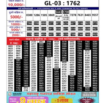 Maharashtra Ganesh Laxmi Lottery Result 24 03 26 Result Editorial Team March 24, 2026 Posted in Maharashtra Lottery Result Other Results in This Time 0 12 Maharashtra Ganesh Laxmi Lottery Result 19 03 26 0 14 Maharashtra Sahyadri Lottery Result 20 03 26 0 13 Maharashtra Mohini Lottery Result 22 03 26 0 4 Maharashtra Lottery Result Today 4PM 23 03 26 0 9 Maharashtra Lottery Result Today 4PM 21 03 26 0 0 Maharashtra Lottery Result Today 4PM 24 03 26 0 4 Maharashtra Gajlaxmi Lottery Result 23 03 26 Author: Result Editorial Team Website