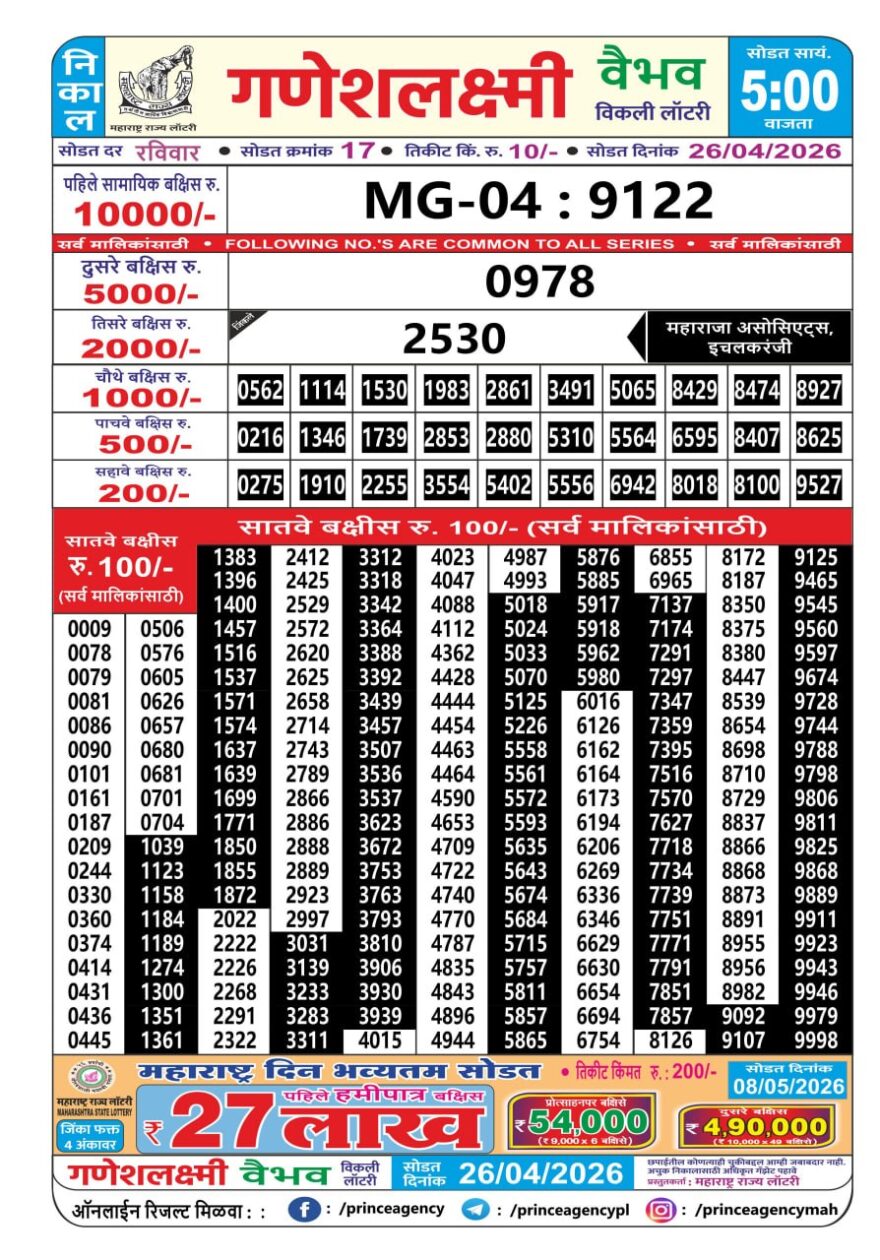 Maharashtra Ganesh Laxmi Lottery Result 26 04 26 Result Editorial Team April 26, 2026 Posted in Maharashtra Lottery Result Other Results in This Time 0 41 Maharashtra Gajlaxmi Lottery Result 22 03 26 0 14 Maharashtra Sahyadri Lottery Result 13 04 26 0 28 Maharashtra Ganesh Laxmi Lottery Result 31 03 26 0 15 Maharashtra Ganesh Laxmi Lottery Result 15 04 26 0 24 Maharashtra Sahyadri Lottery Result 04 04 26 0 17 Maharashtra Gajlaxmi Lottery Result 14 04 26 0 16 Maharashtra Sahyadri Lottery Result 17 04 26 Author: Result Editorial Team Website