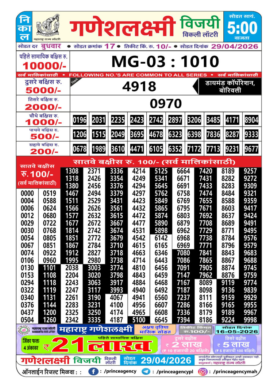 Maharashtra Ganesh Laxmi Lottery Result 29 04 26 Result Editorial Team April 29, 2026 Posted in Maharashtra Lottery Result Other Results in This Time 0 30 Maharashtra Gajlaxmi Lottery Result 01 04 26 0 26 Maharashtra Sahyadri Lottery Result 02 04 26 0 23 Maharashtra Ganesh Laxmi Lottery Result 10 04 26 0 33 Maharashtra Gajlaxmi Lottery Result 23 03 26 0 12 Maharashtra Ganesh Laxmi Lottery Result 22 04 26 0 29 Maharashtra Gajlaxmi Lottery Result 29 03 26 0 16 Maharashtra Gajlaxmi Lottery Result 18 04 26 Author: Result Editorial Team Website