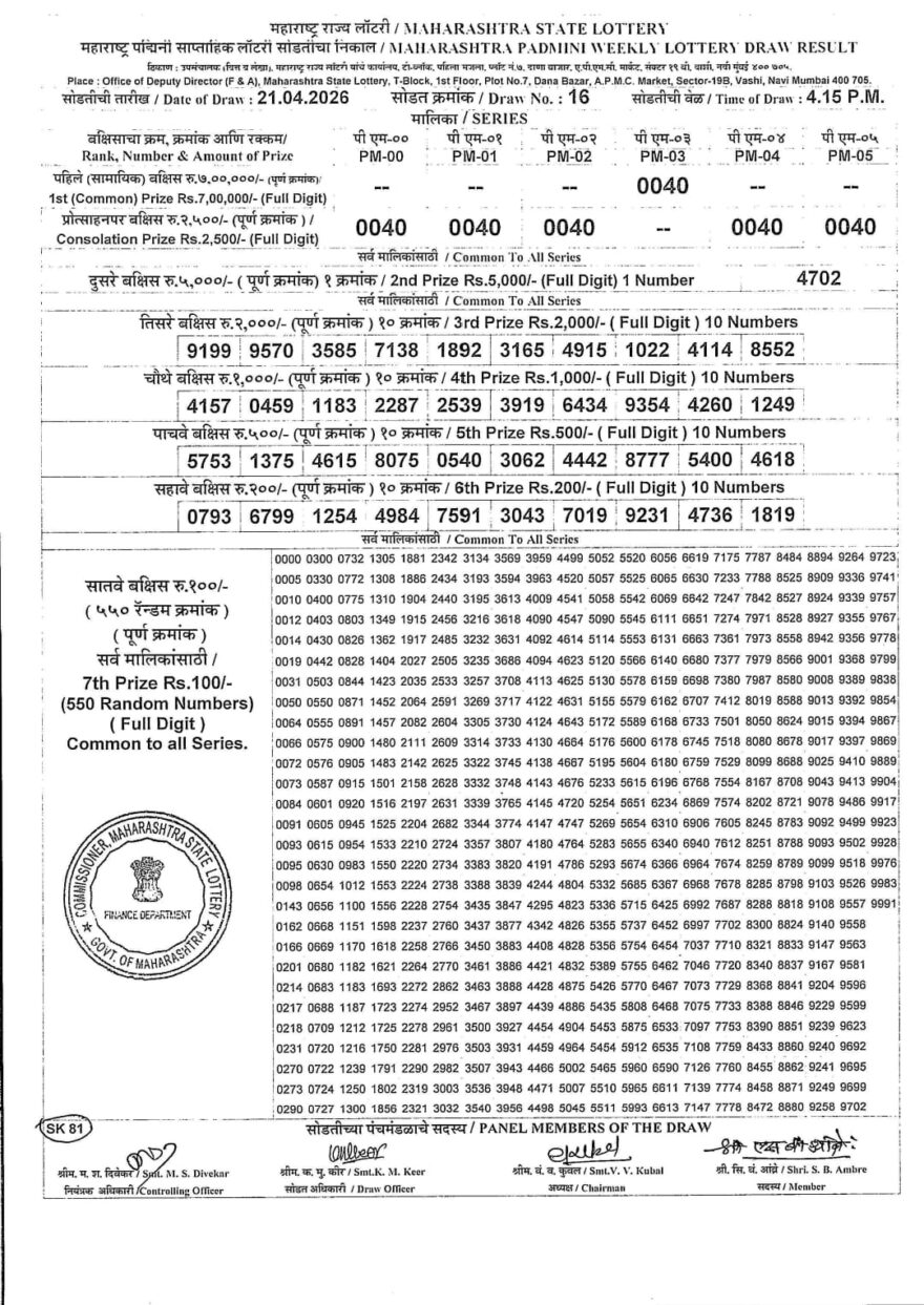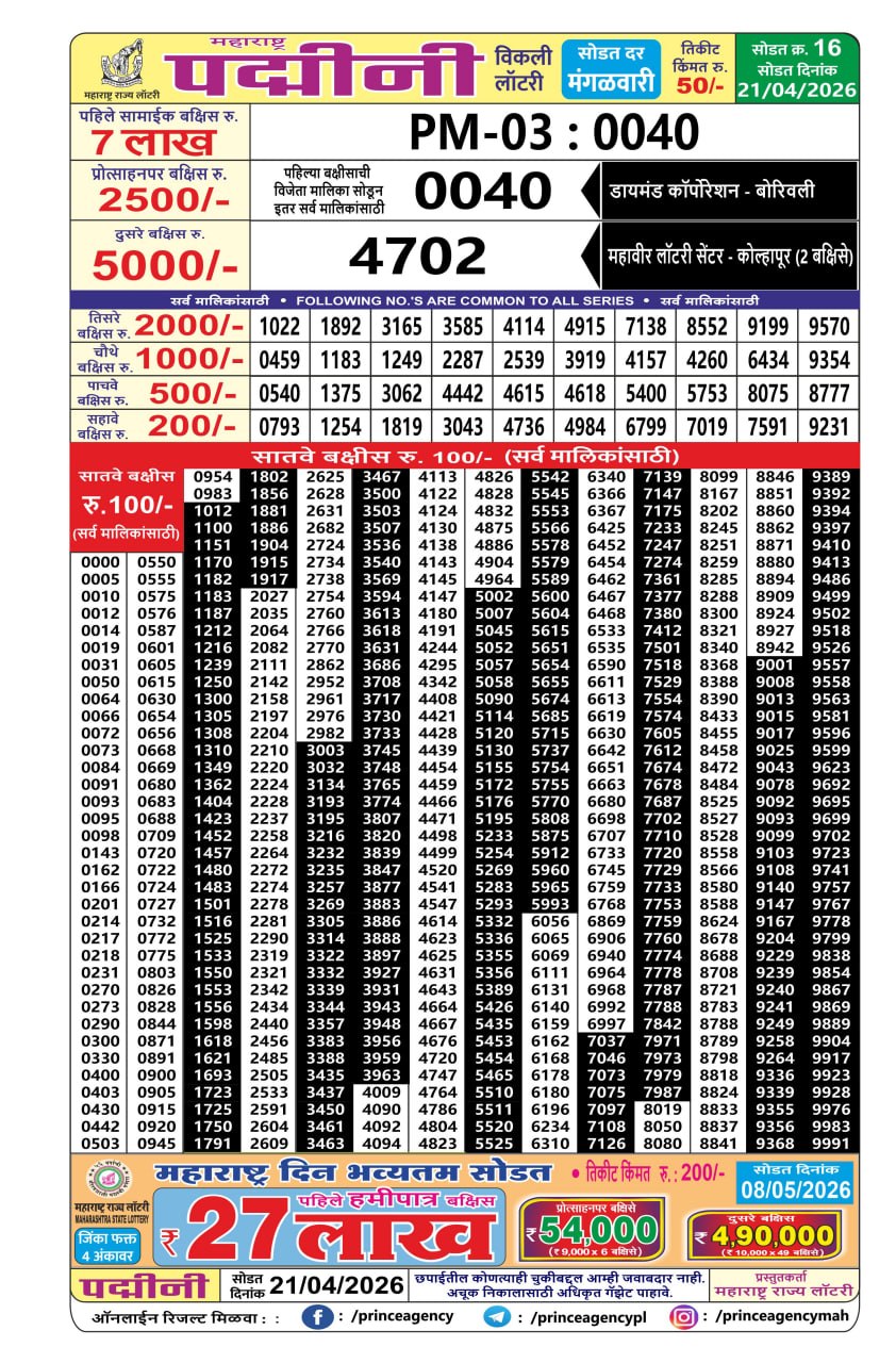 Maharashtra Lottery Result Today 4PM 21 04 26 Result Editorial Team April 21, 2026 Posted in Maharashtra Lottery Result Other Results in This Time 0 53 Maharashtra Ganesh Laxmi Lottery Result 22 03 26 0 13 Maharashtra Gajlaxmi Lottery Result 15 04 26 0 31 Maharashtra Ganesh Laxmi Lottery Result 24 03 26 0 14 Maharashtra Ganesh Laxmi Lottery Result 11 04 26 0 37 Maharashtra Gajlaxmi Lottery Result 22 03 26 0 13 Maharashtra Gajlaxmi Lottery Result 13 04 26 0 41 Maharashtra Sahyadri Lottery Result 19 03 26 Author: Result Editorial Team Website