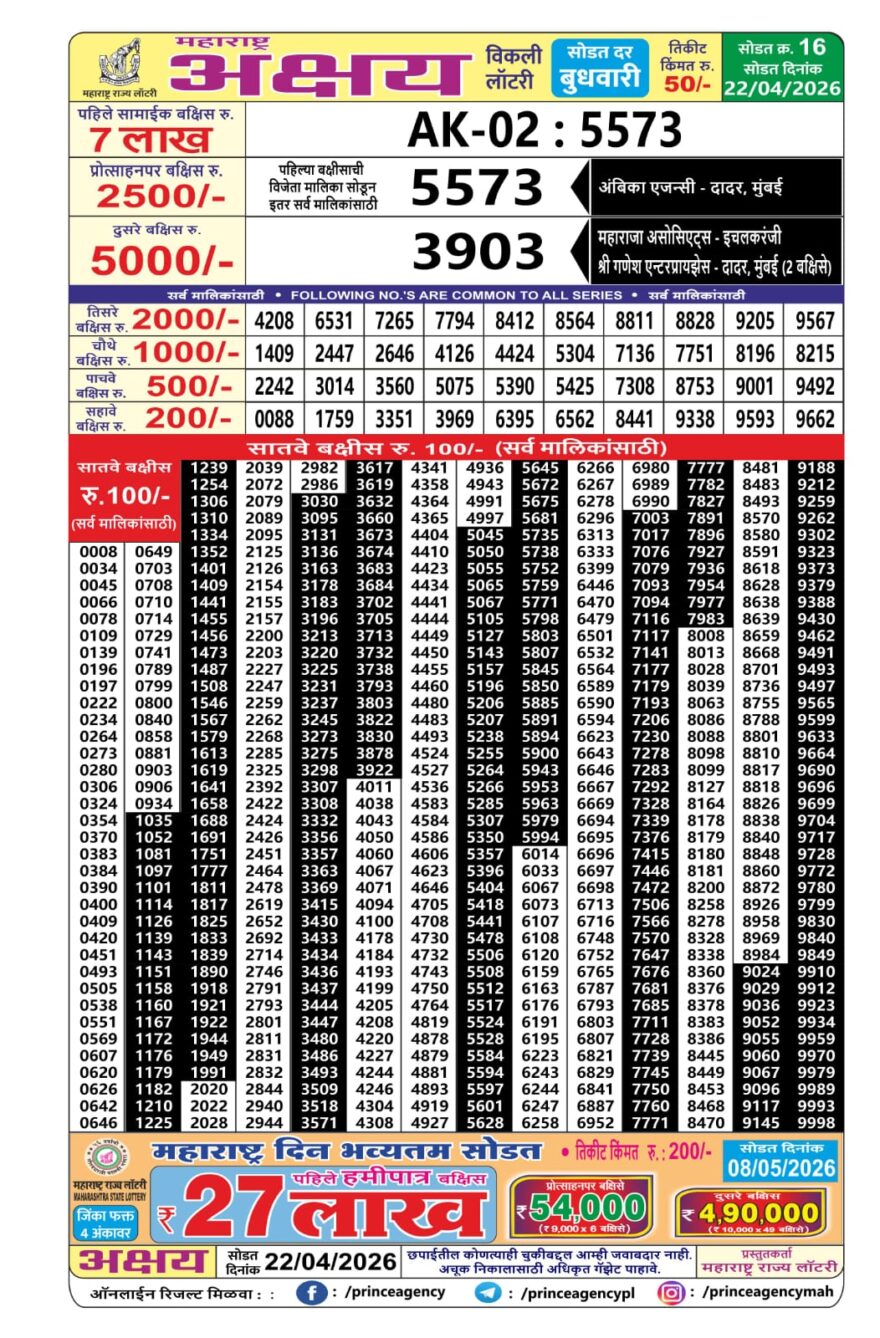 Maharashtra Lottery Result Today 4PM 22 04 26 Result Editorial Team April 22, 2026 Posted in Maharashtra Lottery Result Other Results in This Time 0 21 Maharashtra Lottery Result Today 4PM 08 04 26 0 21 Maharashtra Ganesh Laxmi Lottery Result 06 04 26 0 26 Maharashtra Ganesh Laxmi Lottery Result 03 04 26 0 37 Maharashtra Sahyadri Lottery Result 20 03 26 0 20 Maharashtra Sahyadri Lottery Result 08 04 26 0 13 Maharashtra Ganesh Laxmi Lottery Result 17 04 26 0 18 Maharashtra Ganesh Laxmi Lottery Result 10 04 26 Author: Result Editorial Team Website