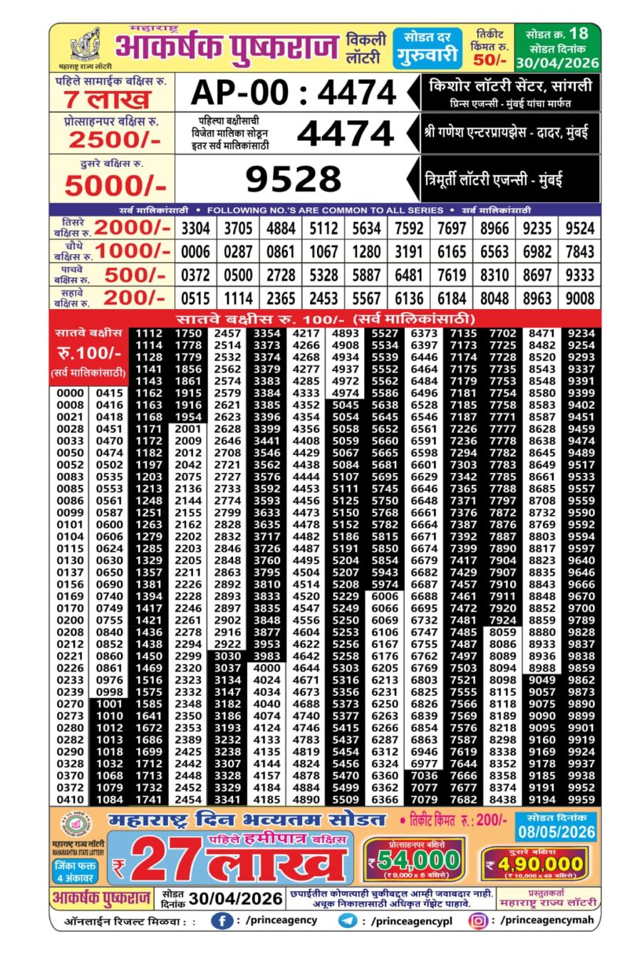 Maharashtra Lottery Result Today 4PM 30 04 26 Result Editorial Team April 30, 2026 Posted in Maharashtra Lottery Result Other Results in This Time 0 27 Maharashtra Gajlaxmi Lottery Result 03 04 26 0 19 Maharashtra Lottery Result Today 4PM 21 04 26 0 3 Maharashtra Sahyadri Lottery Result 30 04 26 0 32 Maharashtra Sahyadri Lottery Result 26 03 26 0 16 Maharashtra Gajlaxmi Lottery Result 13 04 26 0 14 Maharashtra Ganesh Laxmi Lottery Result 21 04 26 0 19 Maharashtra Mohini Lottery Result 12 04 26 Author: Result Editorial Team Website