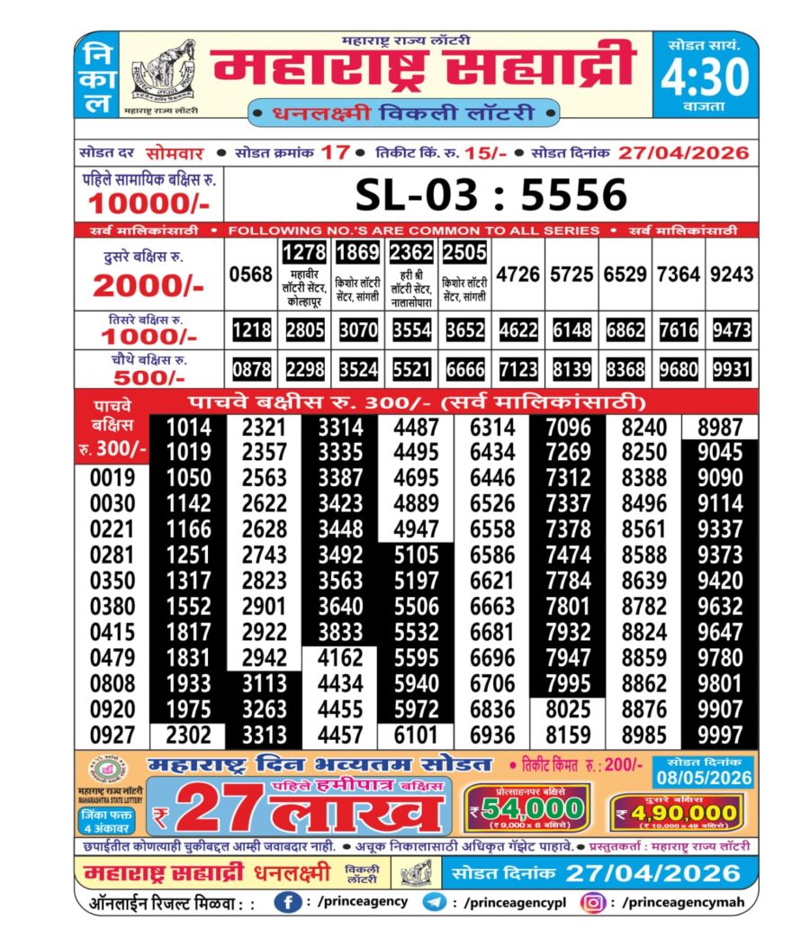 Maharashtra Sahyadri Lottery Result 27 04 26 Result Editorial Team April 27, 2026 Posted in Maharashtra Lottery Result Other Results in This Time 0 26 Maharashtra Sahyadri Lottery Result 02 04 26 0 19 Maharashtra Lottery Result Today 4PM 11 04 26 0 15 Maharashtra Ganesh Laxmi Lottery Result 14 04 26 0 41 Maharashtra Sahyadri Lottery Result 20 03 26 0 34 Maharashtra Gajlaxmi Lottery Result 26 03 26 0 41 Maharashtra Gajlaxmi Lottery Result 22 03 26 0 14 Maharashtra Lottery Result Today 4PM 23 04 26 Author: Result Editorial Team Website