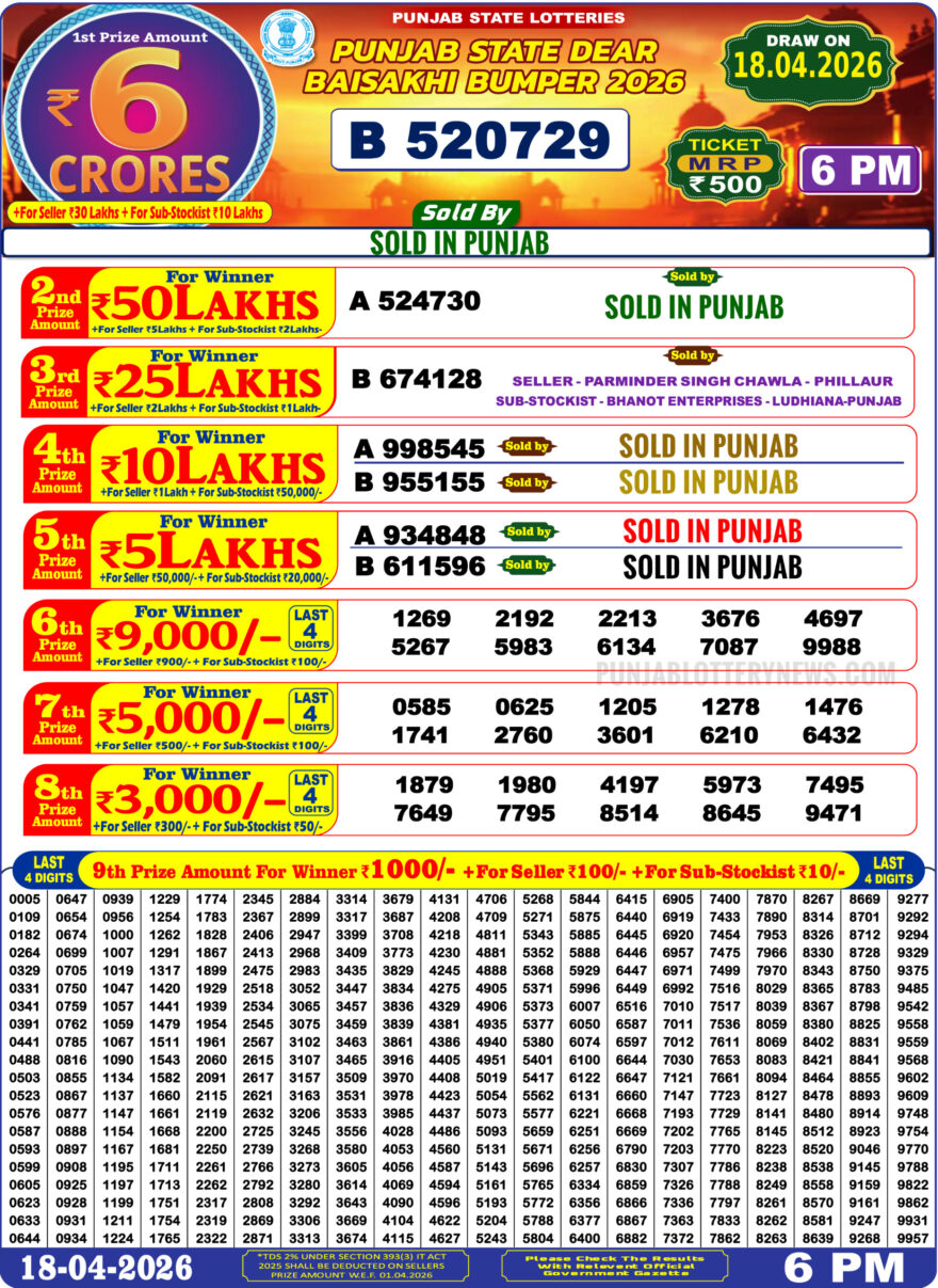 Punjab State Dear Baisakhi Bumper Result 18.04.26 Website Editorial Team April 18, 2026 Posted in Lottery Result Other Results in This Time 0 14 Rajshree 200 Lottery Result 16 04 26 0 28 Goa State Rajshree 200 Monthly Lottery Result 19 03 26 0 15 Punjab State Dear 1000 Quarterly Lottery Result 11.04.26 0 16 Rajshree 150 Monthly Result 09 04 26 0 13 Maharashtra Sahyadri Monthly Lottery Result 11 04 26 0 94 Maharashtra Gudhipadva Bumper Draw Result 2026 Author: Website Editorial Team