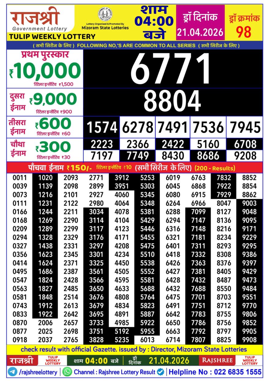 The draw has concluded and the official result for Rajshree Tulip Weekly Lottery Result 21/04/2026 is posted below.