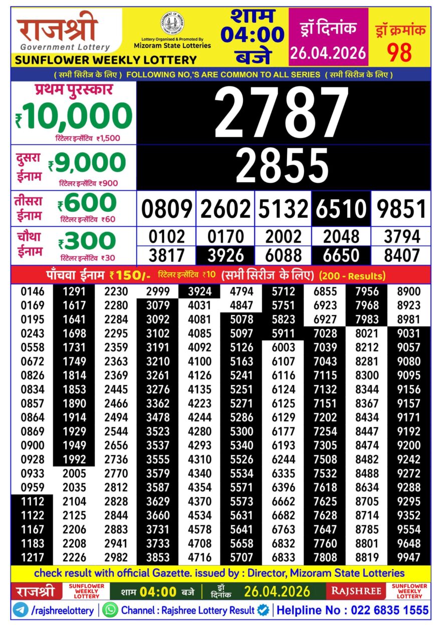 The draw has completed and the official result for Rajshree Sunflower Weekly Lottery Result 26/04/2026 is posted below.